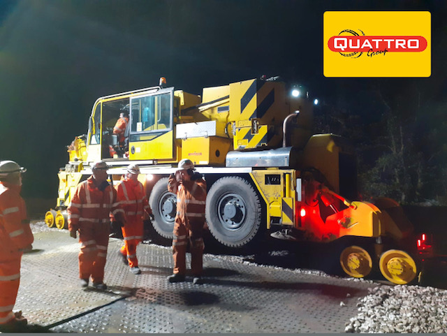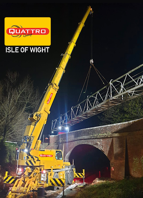 ‘Our Rail Cranes lift many bridges in many different locations around the UK’, said Andy Johnson, Rail Crane Operations Manager for Quattro. ‘It takes a lot of planning and discussions with our different clients and Network Rail in order to ensure we position the correct rail crane with the exacting specifications needed for radius etc for any particular bridge. The Skew Footbridge has now been moved successfully and Quattro will return to put it back again when the job is ready.’