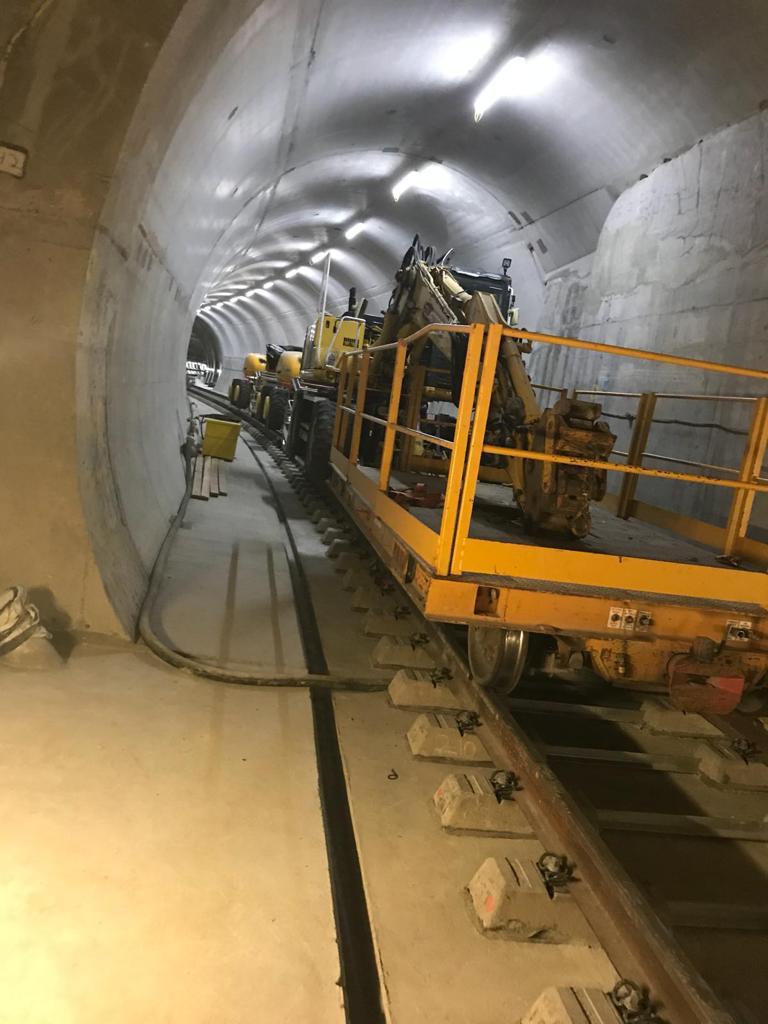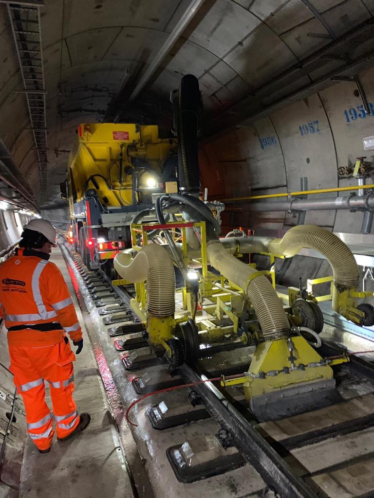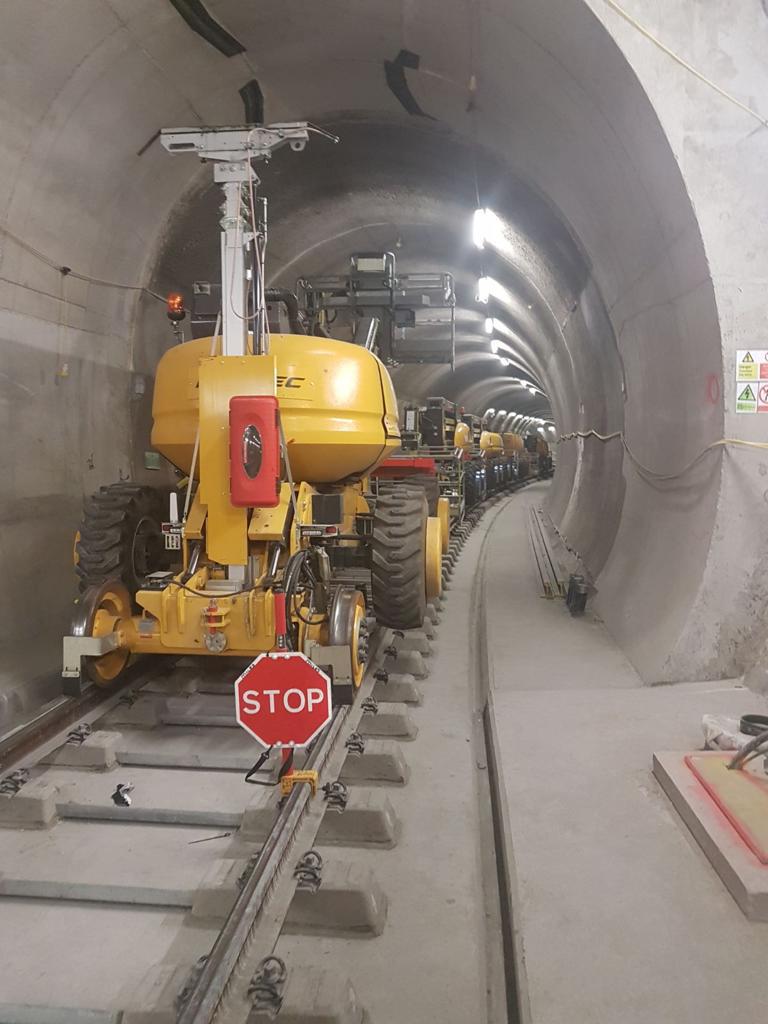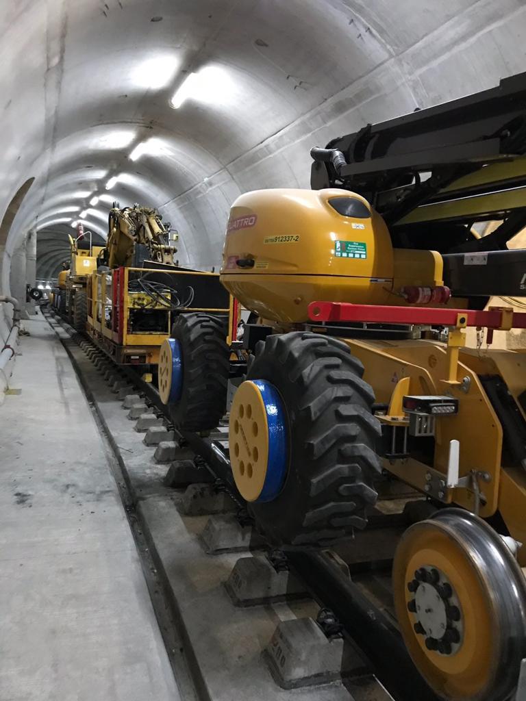 - January 2017 Quattro introduced the Neotec 400R/R MEWP into the project allowing a more versatile working arrangement with the increased 400kg basket capacity. By July 2017 Quattro had from 10-12 RRV’s and at its peak 30 RRV MEWPS working full time on the project with a good percentage of the machines doing both day and night shifts. Quattro’s unique RRV Suction Excavation Lorry (Dumbo) was brought in to work on the project from July 2017 and also saw a long stint in the tunnels, cleaning anything deemed necessary. A specially adapted towable trolley was used to clear debris and dirt left over by the construction crews from the tunnel floor and around the rail fastenings.